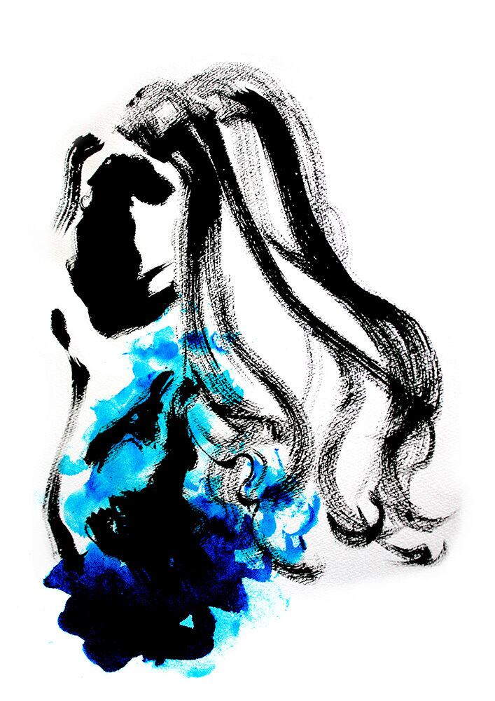 ⚪︎筆で描いた青い服の横顔の女性の絵をグラフィックソフトで仕上げたものです。