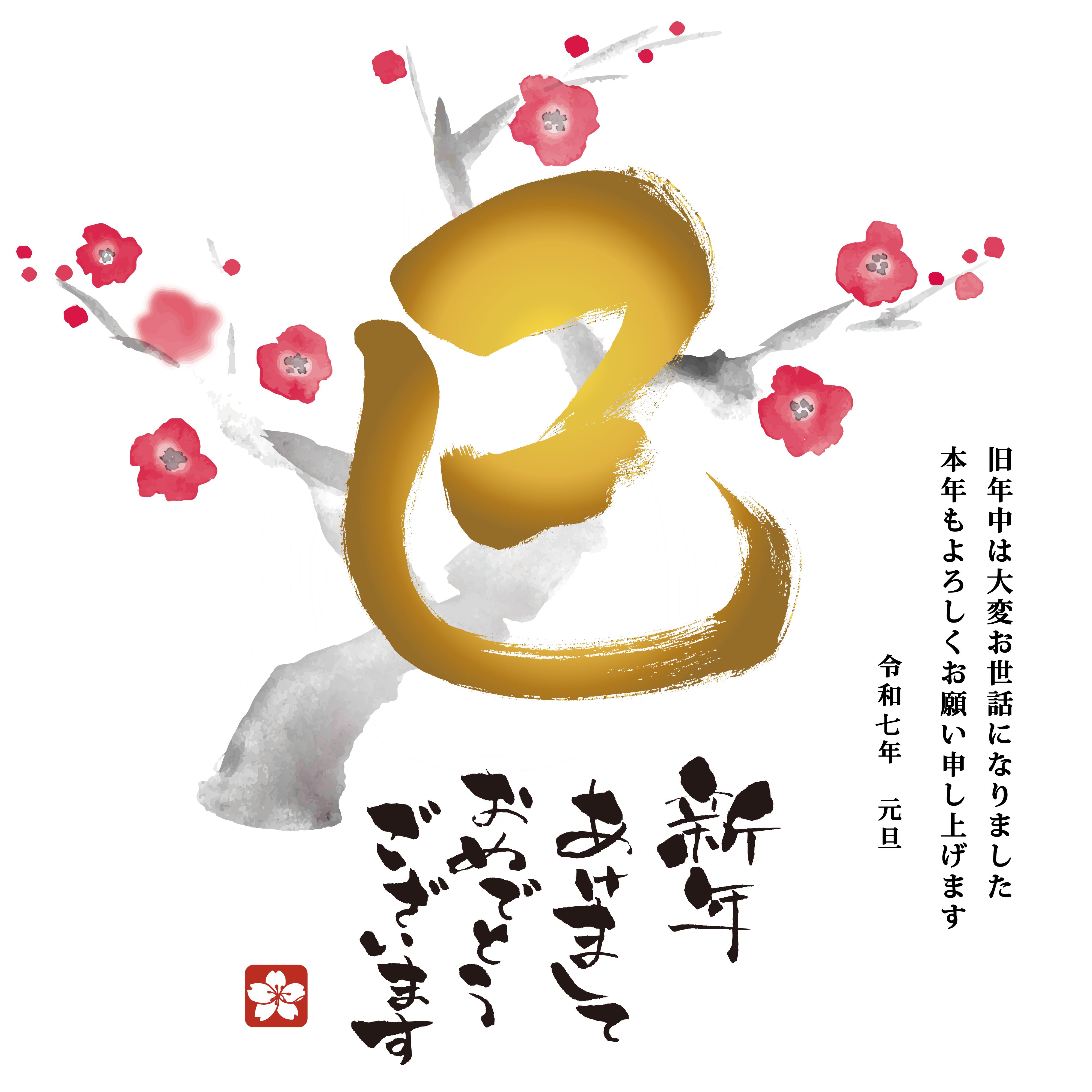 2025年 巳年 年賀デジタルデータ(07)筆文字+梅 金色【挨拶文あり】
